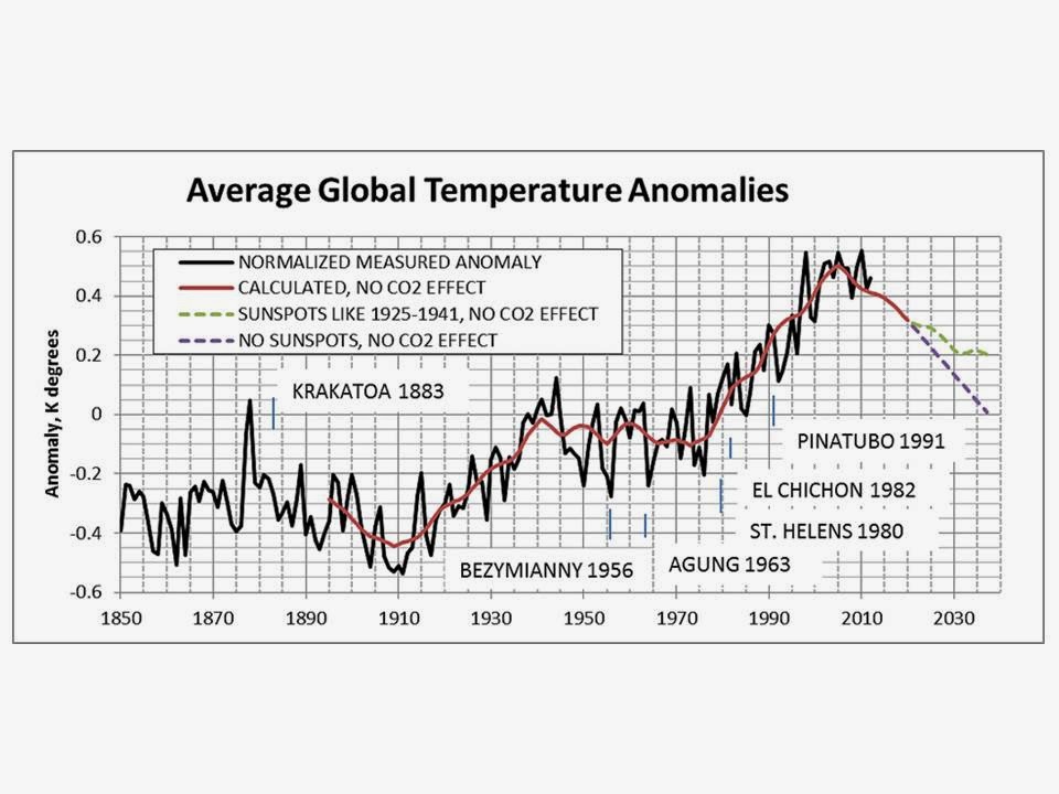 Molto interessanti sono le due linee tratteggiate in verde e viola. Quella verde rappresenta l'anomalia di temperatura prevista nell'ipotesi che il sole abbia un'atività simile a quella media tra il 1925 ed il 1941. Quella viola stessa cosa ma nell'ipotesi che il sole rimanga inattivo.