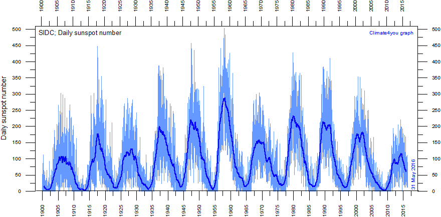 Come visione d’insieme, notare come l’attività è andata decrescendo dagli anni 80 ad oggi, arrivando a dei livelli simili a quelli molto freddi di inizio secolo. E se qualcuno avesse ancora dubbi sull’influenza del sole, basta ricordare che gli anni 70 sono stati gli anni in cui si parlava dell' avvento di una nuova era glaciale, e guarda caso hanno corrisposto all’unico ciclo da quasi un secolo ad essere molto debole.Ma niente in confronto a quello che sta accadendo adesso al nostro sole!