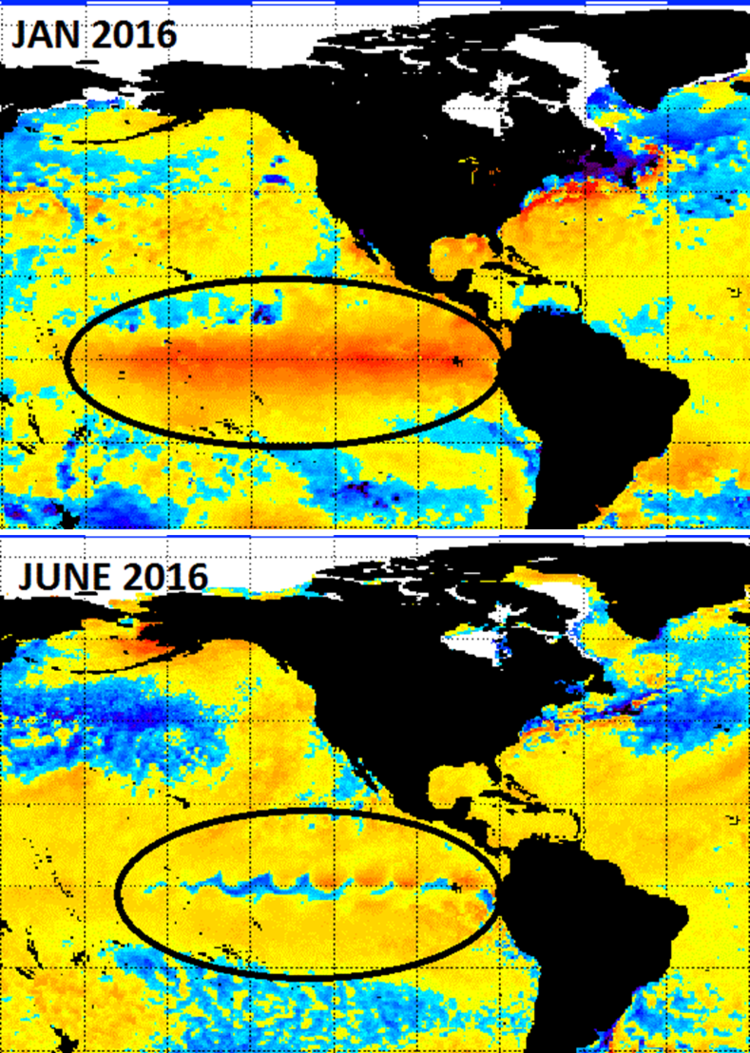 Le temperature superficiali sono cambiate drasticamente a partire dall’inizio dell’anno. Notare in particolare il pattern ad onde di acque fredde nel Pacifico centrale.